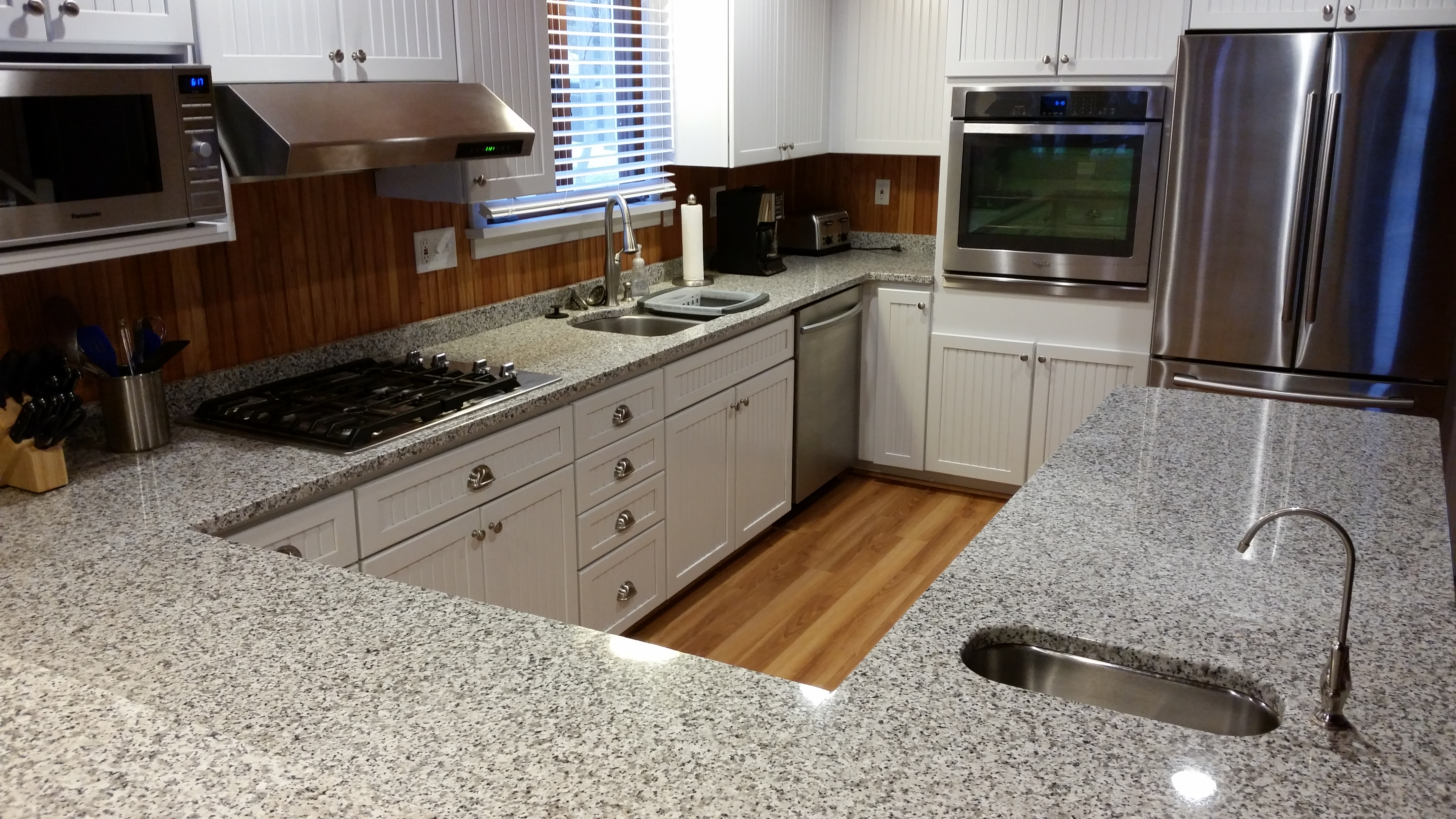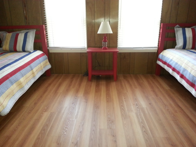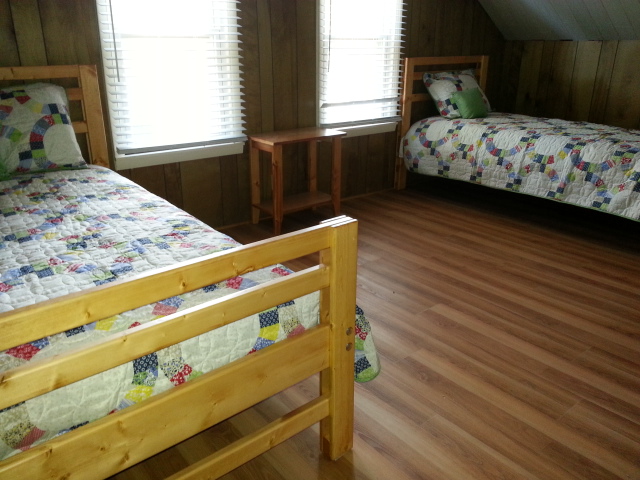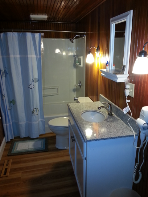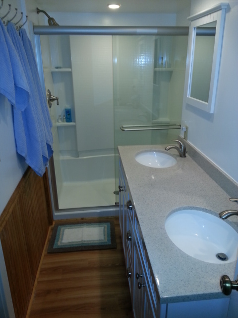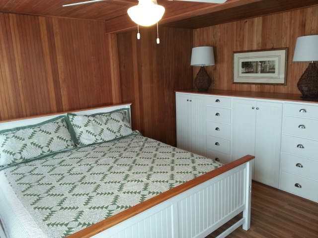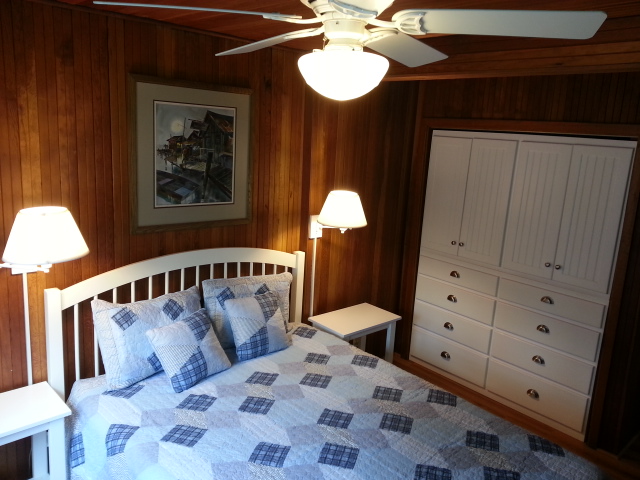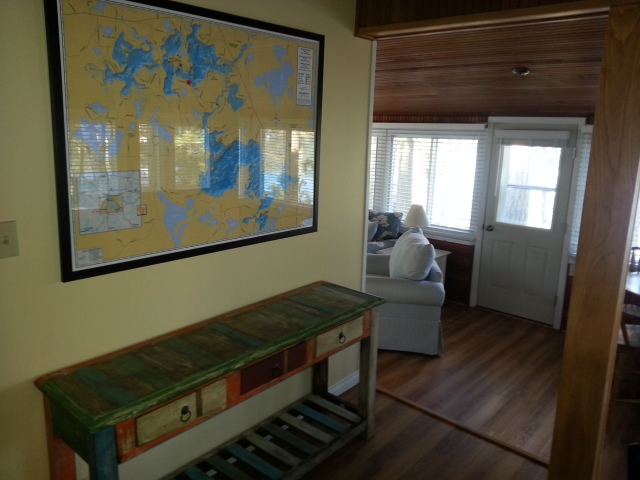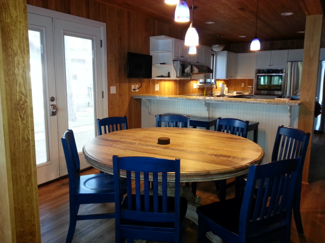 countertops, French doors leading to a deck, four LED TV's, wifi, AC, Weber grill, sandy swimming area, and use of a dock slip.
